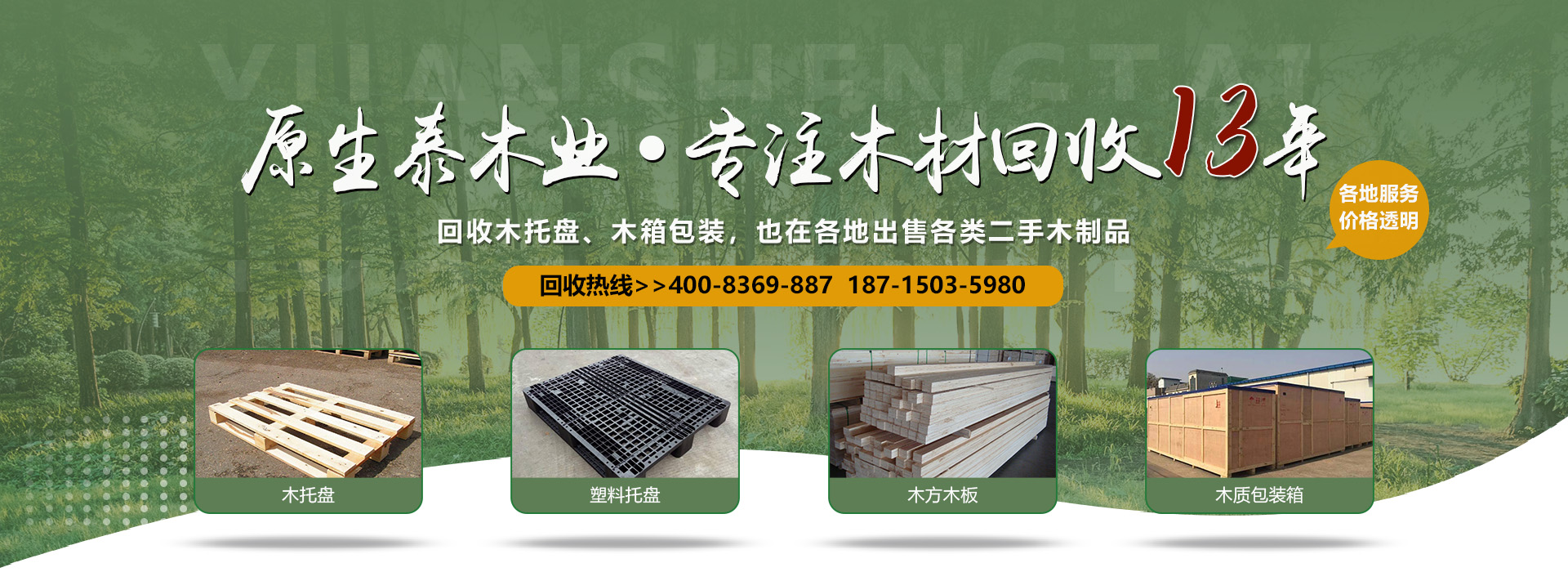 原生泰木業(yè)有限公司是一家服務(wù)各市的企業(yè),本公司是以回收各類二手廢舊木材為主,主要回收各類木托盤、塑料托盤、木箱包裝、建筑木方木板、木棧板等等。本公司收購價格以托盤、木箱木材的規(guī)格、使用情形、新舊程度、材質(zhì)為估價標(biāo)準(zhǔn),如果您有意向出售您的閑置木制品以及塑料制品,請您聯(lián)系我們時告知其數(shù)量、尺寸、型式、使用情形,我們免費為您提供電話估價或到現(xiàn)場報價。本公司是一家經(jīng)工商局嚴(yán)格注冊的正規(guī)木制品回收公司,回收木托盤、木箱包裝致力于環(huán)保建設(shè)、綠色合作以求雙贏。同時原生泰木業(yè)公司也對各地范圍出售二手木托盤、二手塑料托盤、各種二手木制品。及時送貨上門,價格公道。公司下轄木材加工廠,組裝廠,并備有大型標(biāo)準(zhǔn)烘房,多功能平板刨,壓刨,挖槽,機(jī)械設(shè)備等。產(chǎn)品主要生產(chǎn)各類木托盤、木包裝箱銷往國內(nèi)大中型城市并隨貨通行出口國外。本公司將以豐富的知識,提供合適的方案來服務(wù)和滿足每一用戶不同的需求,品質(zhì)至上,誠實守信。